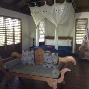 The Frangipani Bure is directly on the beachfront. Just one step off the balcony onto the sand and just another 10 steps to the water’s edge. Watch the sunrise and set in the beautiful Pacific ocean from your room. The front doors are tinted glass allowing privacy and a view both during the day and by night.